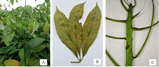 The samples collected from rubber plants of clone IAN-710 showed symptoms of anthracnose (Figure 1A): in the leaves, small, circular, irregular, cream-colored necrotic water spots were observed, which later turned dark with yellow edges (Figure 1B) ; in addition, split black lesions and descending petiole death were observed in the stems (Figure 1C).
