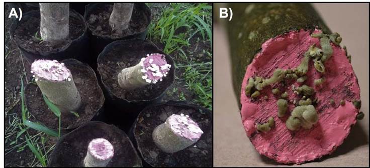 A) Diseased stumps; B) Fruiting bodies in the tissue.