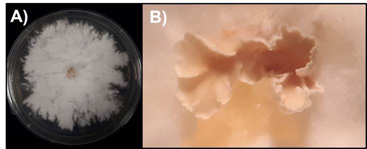 A) White-creamy, cottony colony in MEA culture medium; B) Formation of fruiting bodies 10 days after sowing.