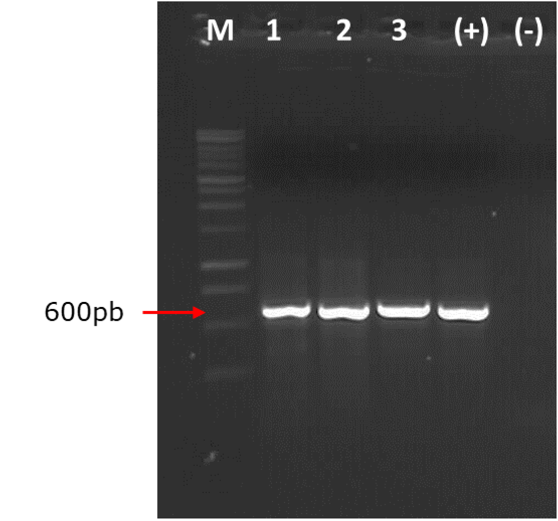M = 1kb molecular marker, lane 1 to 3 samples of Schizophyllum commune; (+) = Positive control; (-) = Negative control (Nuclease-free water).