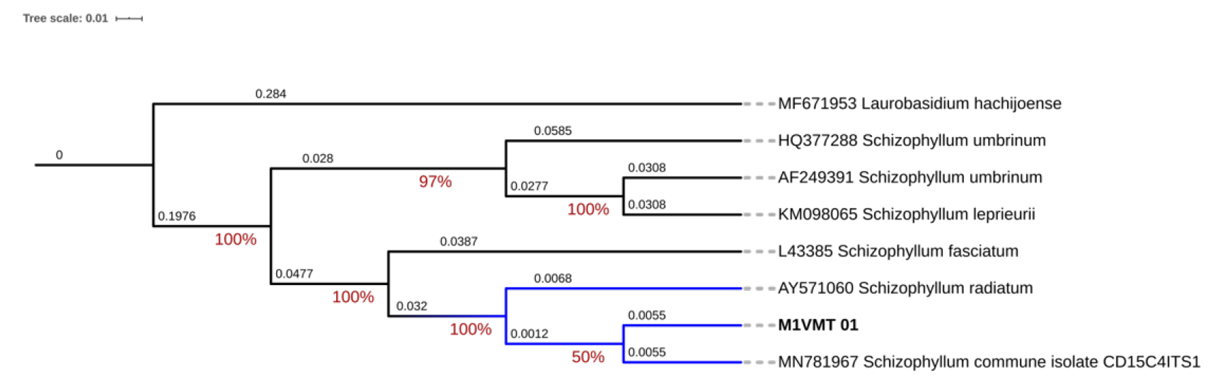 The phylogenetic tree of Schizophyllum commune was generated from 2 000 000 generations. Phylogenetic reconstruction showed that the MZVMT_01 isolate clustered in the same clade with the S. commune sequence MN781967 (Figure 4), which corresponds to a strain in a study of wood decay fungi in Northwest Arkansas forests (Alshammari and Stephenson, 2018).