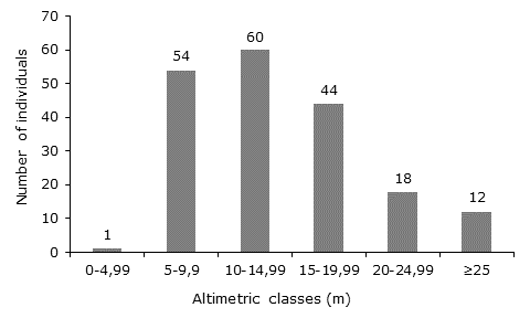 Altimetric distribution. In Caquetá and Putumayo, the individuals were distributed into six altitudinal classes; 60 % of the individuals (115) were concentrated in the middle stratum, with heights of less than 15 m (Figure 3).