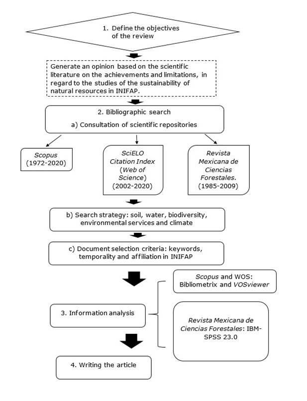 The thematic review covered the period from 1985 to 2020 within the framework of the 35th anniversary of INIFAP, except where otherwise stated. A consultation on the resources soil, water, biodiversity, environmental services and climate, was carried out in the following databases: Scopus (https://www.scopus.com), Web of Science (WoS), SciELO Citation Index, (https://clarivate.com/webofsciencegroup/solitions/webofscience-scielo) and the Mexican Journal of Forestry (Revista Mexicana de Ciencias Forestales, RMCF, https://cienciasforestales.inifap.gob.mx). Figure 1 describes the stages of the literature review process.