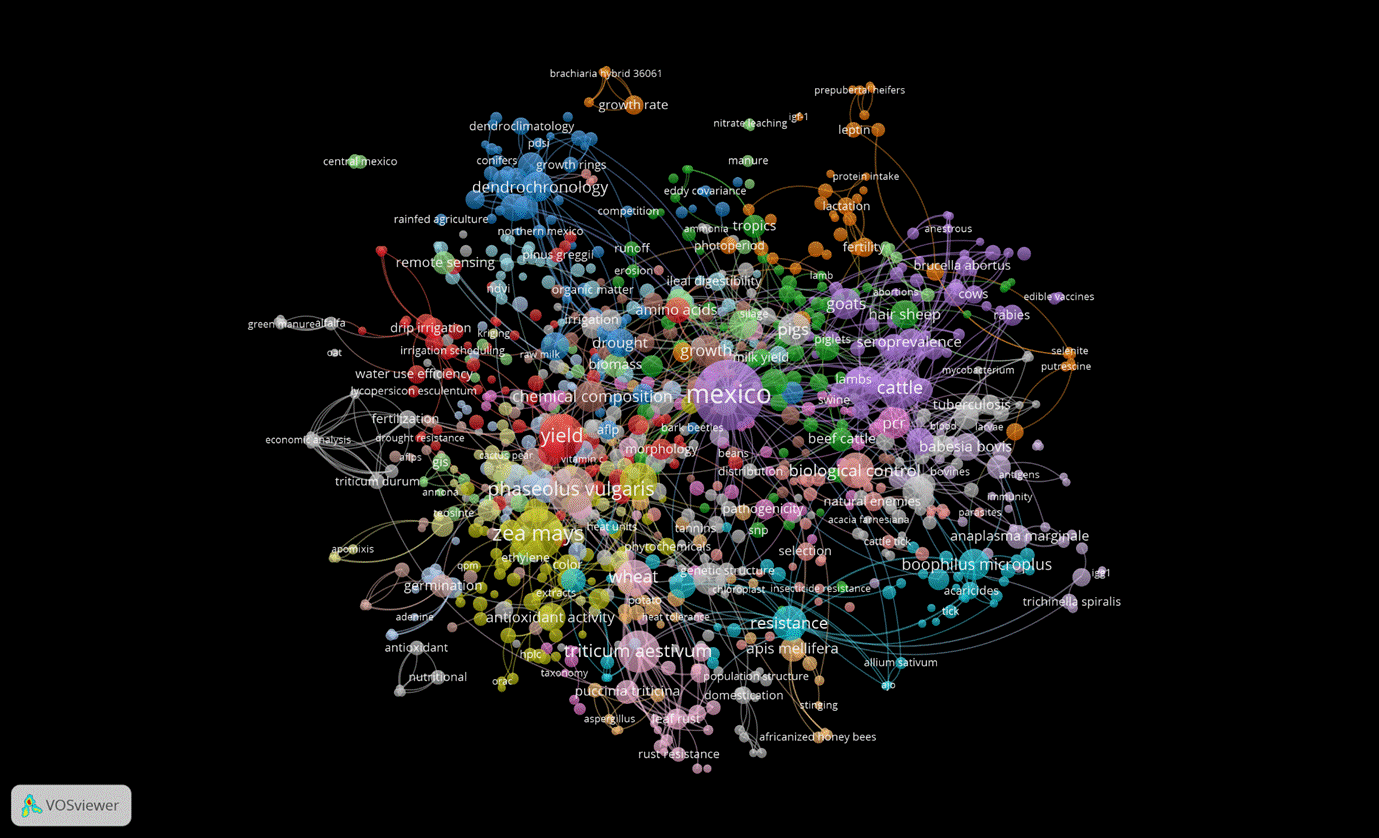 The analysis of the information collected in the total Scopus database showed that the central themes of the publications of researchers attached to INIFAP and its predecessor institutes ―INIF, INIA, and INIP― were related to the keywords corn, yield, and livestock (Figure 2).