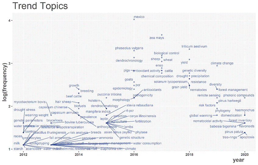 Figure 5 Trend topics in the key words in the delimited Scopus search for researchers attached to INIFAP (2000-2020).
