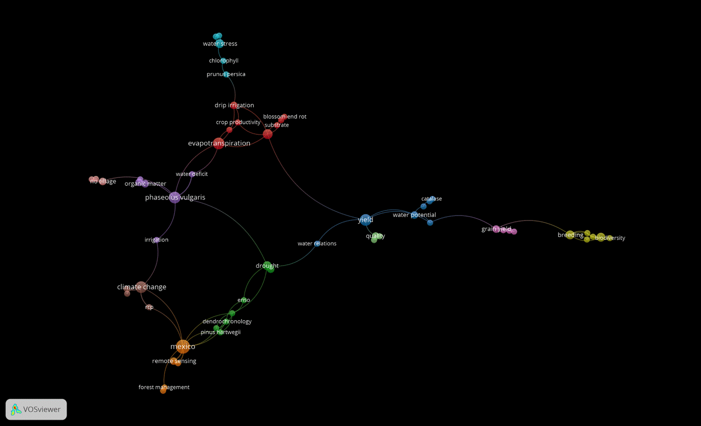 Figure 8 Co-occurrence network for the search of articles by INIFAP researchers on the sustainability of natural resources included in the SciELO Citation Index (2002-2020).