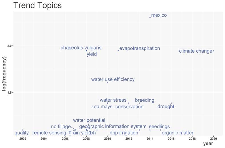 Figure 9 Trend topics among the keywords in publications on the sustainability of natural resources by researchers affiliated to INIFAP included in the SciELO Citation Index.