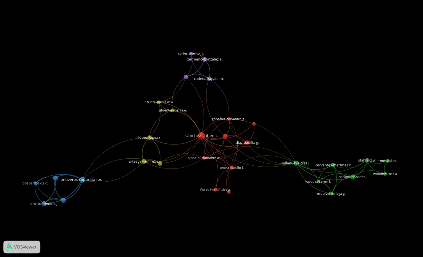 It is worth noting that the core group (Sánchez-Cohen et al.) also maintains collaborations with researchers abroad (Sánchez-Cohen et al., 2006). Both Sánchez-Cohen and Villanueva-Díaz are researchers affiliated to the Centro Nacional de Investigación Disciplinaria en la Relación Agua, Suelo, Planta y Atmósfera, CENID-RASPA (National Center for Disciplinary Research on Water-Soil-Plant-Atmosphere Relationship), where fundamental aspects for the sustainability of natural resources (soil, water, climate) are addressed. In addition, sharing a physical space facilitates the interrelation of work, as evidenced by the co-authorship connection between Villanueva-Díaz and Cerano-Paredes (Figure 7).