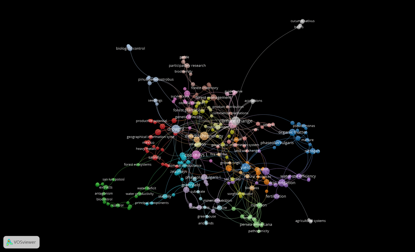 Figure 4 Keyword co-occurrence network in the delimited Scopus search for researchers affliated to INIF, INIA, INIP, and INIFAP (2000-2020).