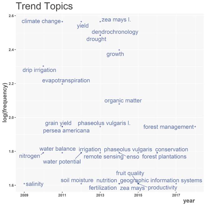 The dynamics of trend topics began in 2009 with climate change, while in 2012, the topics of interest were productivity and drought; finally, in the last four years, forest management, forest plantations and conservation have begun to stand out (Figure 9).