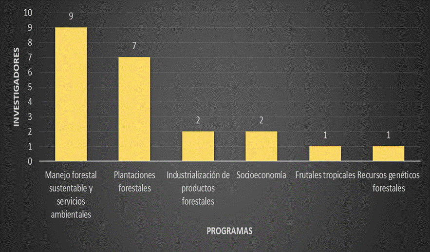 Figure 13 INIFAP researchers that published on the Sustainability of Natural Resources in the Mexican Journal of Forest Sciences (Revista Mexicana de Ciencias Forestales), by research program (1985-2009).