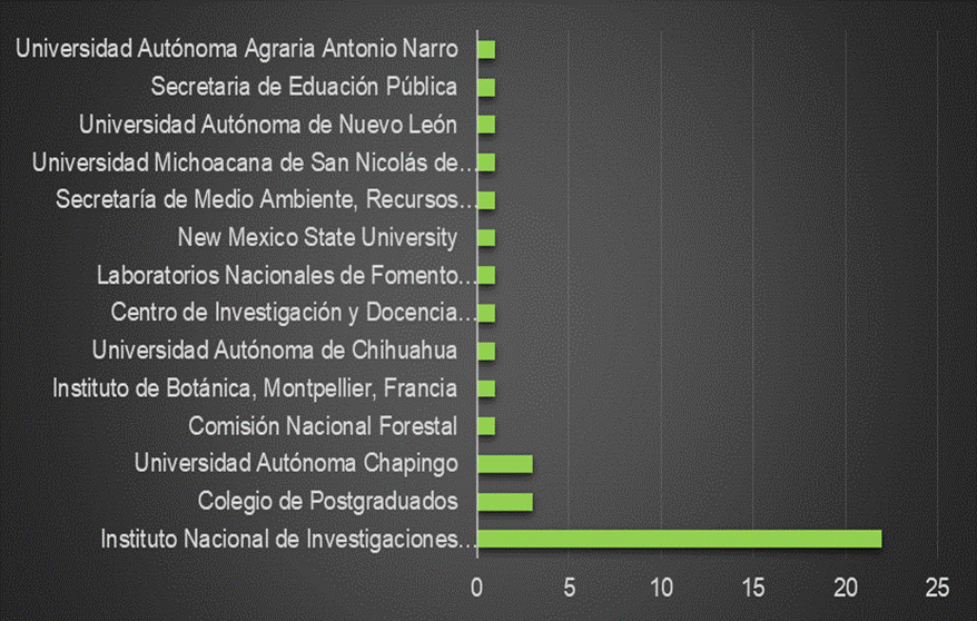 Of the articles published in the RMCF on the Sustainability of Natural Resources, 14 affiliations of the participating authors were identified, of which 78.6 % of the articles include INIFAP researchers, while the Colegio de Postgraduados (College of Postgraduates) and the Universidad Autónoma Chapingo are at 10.7 % each (Figure 14). The rest of the institutions appeared only on one occasion.
