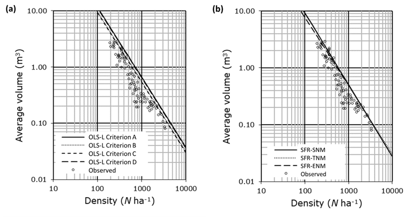 Figure 1 Self-thinning lines obtained by OLS (a) and SFR (b) techniques with respect to observed data.
