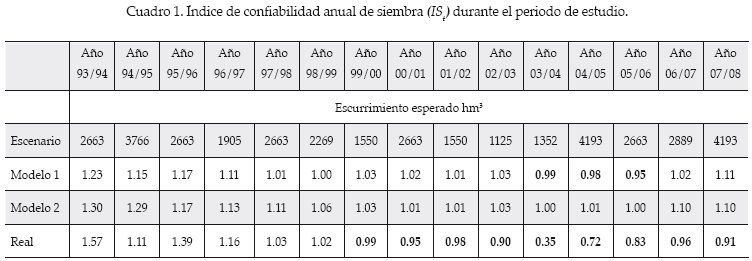 El cuadro 1 muestra los índices anuales de confiabilidad de siembra (ISt), observándose en el escenario Modelo1 tres años de fallas mínimas (valores menores de 1.0), siendo en el año agrícola 2005-2006 donde se observa el valor mínimo de 0.95, obteniéndose un índice promedio de seguridad de siembra en el periodo de 1.05. Al incrementar el volumen de agua bombeada del acuífero en el Modelo2 no se observa ningún año de falla y se pudo sembrar el 100% de la superficie, al menos con primeros cultivos en todos los años, lográndose un índice de seguridad de siembra promedio en el periodo de 1.09. Mientras que en el Escenario Real, la falla se observa desde el año agrícola 1999-2000 y el valor mínimo del índice de siembra de 0.35 se obtuvo en el año agrícola 2003-2004, obteniendo un valor del índice de siembra promedio en el periodo de 0.99, valor menor que los obtenidos en ambos escenarios modelados.