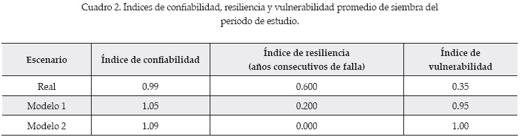 El cuadro 2 muestra los índices sustentables de confiabilidad, resiliencia y vulnerabilidad de la superficie sembrada promedio durante todo el periodo de estudio. Bajo el Escenario Real, 99.0% de la superficie regable es sostenida en promedio en el horizonte de planeación, lo que significa que en promedio sólo se lograron establecer 203 940 hectáreas cada año agrícola. Se observan además nueve años consecutivos de fallas durante el periodo de sequía, representando el 60.0% de los años con falla, registrándose el mayor riesgo (más vulnerable) en el año agrícola 2003-2004, donde se sembró únicamente el 35% de la superficie regable.