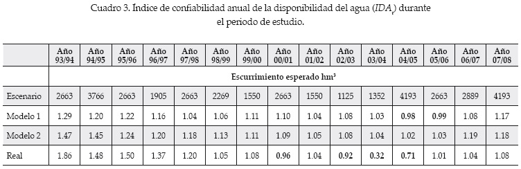 El cuadro 3 muestra los índices anuales de confiabilidad (IDAt) de proporcionar el volumen requerido por el sistema agrícola bajo los tres escenarios de manejo. En el escenario Modelo1, el volumen requerido por los cultivos se pudo proporcionar durante todo el periodo de estudio, con mínimas fallas en los años agrícolas 2004-2005 y 2005 2006, donde el volumen necesario se redujo sólo el 2 y 1%, respectivamente. En el escenario Modelo2, el volumen requerido se sostiene sin ninguna falla durante todos los años considerados en el horizonte de planeación, proporcionando el volumen de agua necesario para sembrar al menos el 100% de la superficie regable con primeros cultivos y en casi todos los años; también se logra abastecer una cantidad de agua para segundos cultivos. Sin embargo, con el Escenario Real se tienen fallas en cuatro de los quince años, observándose que en el año 2003-2004 sólo se logró proporcionar el 32% del volumen requerido para establecer los primeros cultivos y el siguiente año sólo el 71%.
