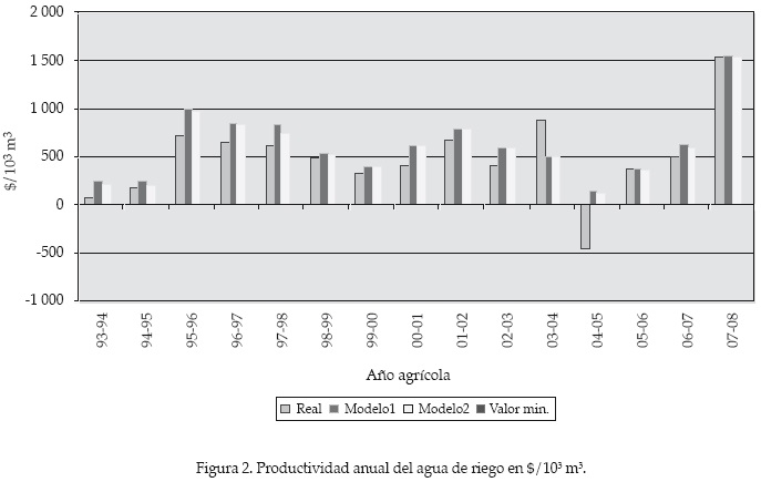 La figura 2 muestra cómo los valores de la productividad anual del agua obtenidos con el Escenario Real son menores que los obtenidos tanto con el Modelo1 como con el Modelo2, excepto en el año 2003-2004, donde en el Escenario Real se utilizaron solamente 499 hm3, mayormente para la irrigación de hortalizas, las cuales son los cultivos más rentables que se siembran en el distrito; mientras que con los escenarios Modelo1 y Modelo2, en este mismo año agrícola se logró suministrar el 100% del volumen requerido para el establecimiento de todo el patrón de cultivos del distrito.