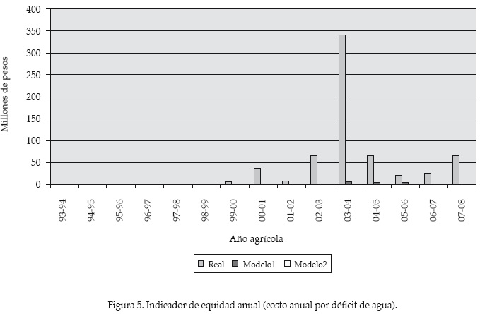 La figura 5 muestra cómo en el Escenario Real, el indicador de equidad anual o costo por déficit de agua se empieza a manifestar desde el año 1999-2000, haciendo crisis en el año 2003-2004, donde en este periodo no se logró sembrar el 100% de la superficie anual regable con primeros cultivos, reduciendo la derrama económica derivada de la actividad agrícola. El escenario Modelo1 muestra que del año 2003-2004 al 2005-2006 se tuvo un pequeño déficit, como lo muestra el costo por déficit de agua con valores de 7, 5 y 6 millones de pesos en cada año, respectivamente. En el escenario Modelo2, el valor del costo por déficit de agua en todos los años del periodo analizado fue cero (óptimo), ya que en todos los años se lograron sembrar más de 206 000 hectáreas. Del análisis anterior se puede afirmar que el escenario que tuvo mayor costo por déficit de agua en todo el periodo fue el Escenario Real, considerando que no hubo equidad en algunos años agrícolas en la distribución de los beneficios derivados de la agricultura, sobre todo en el año 2003-2004; por el contrario, el escenario más equitativo fue el Modelo2.