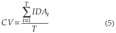 La confiabilidad promedio de proporcionar el volumen requerido por los módulos de riego (CV) está dada por la relación entre la suma de los índices anuales de disponibilidad de agua (IDAt) y el número total de años (T) considerados en el horizonte de planeación del modelo: