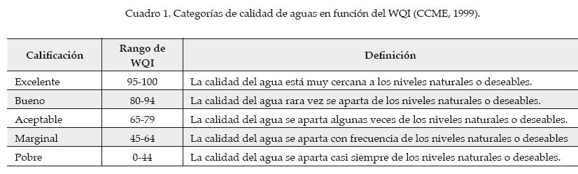 El Canadian Council of Ministers of Environment (CCME) determinó con base en el WQI cinco categorías que califican el agua de un determinado curso (cuadro 1).