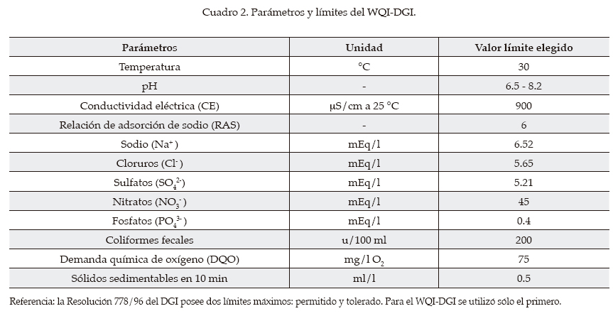 Para la construcción del índice WQI-DGI, en función de la normativa provincial (Resolución 778/96), se utilizaron sólo aquellos parámetros físico-químico-biológicos que figuraran con valores límites permitidos. En el cuadro 2 se presentan los mencionados parámetros con sus unidades de medida y límites máximos, pudiendo apreciarse un cierto equilibro entre físico-químicos, metales pesados y bacteriología.