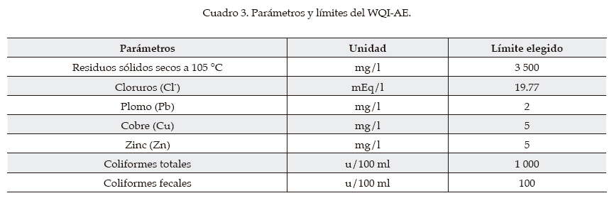 El cuadro 3 permite analizar los parámetros seleccionados por las agencias del agua de Francia (AE) para la construcción del WQI. En este país existen distintas clasificaciones, cuyos límites permitidos varían en función de los distintos usos del agua (riego, consumo humano y animal, etcétera).