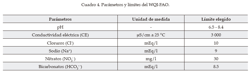 Así como la OMS ha elaborado recomendaciones de calidad para el agua destinada al consumo humano, la FAO propone normativas de calidad para el agua con fines de riego. Dichas recomendaciones son más difíciles de usar que las normativas oficiales de los países, puesto que están compuestas por tres guías con diferentes límites: uso sin restricción, uso con restricciones (bajas a altas) e imposibilidad de uso (Ayers & Westcot, 1994). Siendo las aguas de Mendoza naturalmente salinas, para la confección del WQI-FAO se decidió utilizar la guía de uso con restricciones bajas a altas; en ella, los límites son bastante altos, por lo que la calidad de los ríos tendería a ser buena. Es de notar que con excepción del pH sólo la mineralización está considerada; no hay mención de parámetros biológicos, metales pesados ni sólidos (cuadro 4). No se ha tenido en cuenta el RAS, ya que habría que elegir un límite para cada nivel de conductividad eléctrica. Cambiar el límite no es aceptable en la metodología.