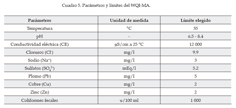 4. Índice WQI-MA, a fin de comparar los resultados obtenidos en los oasis de Mendoza con los de un país como Marruecos, cuyo entorno medioambiental es muy similar.