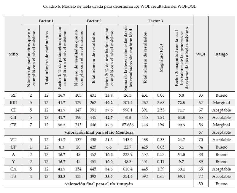 No resulta factible incluir todas las bases de datos usadas en el cálculo de WQI, ya que se dispone de aproximadamente 750 muestras en las que se han analizado de 6 a 12 parámetros, según el índice analizado. El cuadro 6 muestra los parámetros, resultados y factores usados para calcular el WQI-DGI y la calificación resultante.