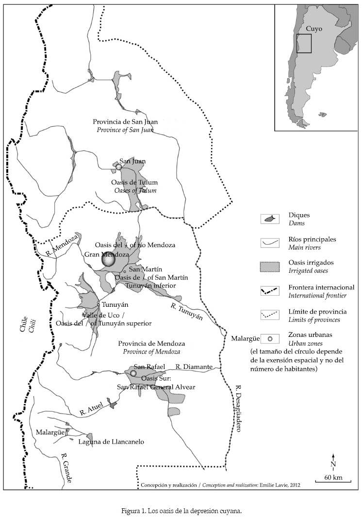 La región de Cuyo (Argentina), una depresión existente entre la Cordillera de Los Andes (al oeste) y las sierras de Córdoba y San Luis (al este) (figura 1) es una región árida-semiárida, en la que el desarrollo agrícola y urbano fue posible sólo gracias a la existencia de ríos andinos abastecidos por glaciares ubicados alrededor de los 6 000 msnm de altitud. Desde antes de la colonización, estos ríos fueron derivados con fines de riego agrícola y de uso doméstico (agro-alimentación). Una media docena de "oasis" concentran la actividad antrópica de la zona árida de Cuyo. Entre los más importantes están el Oasis Norte (ríos Mendoza y Tunuyán inferior, con ≈ 2 000 km2) y el Oasis Centro (río Tunuyán superior, con ≈ 1 000 km2). Este último también es conocido como el Valle de Uco, donde se ha producido la mayor expansión de superficie cultivada de los últimos 20 años destinada a vitivinicultura de alta calidad (CV Malbec).