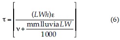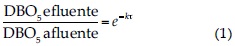 donde DBO5 efluente y DBO5 afluente son las concentración de demanda bioquímica de oxígeno (DBO5) en el efluente y afluente, respectivamente; k, la constante de velocidad cinética, y τ es el tiempo de retención hidráulica. Para el cálculo de τ se aplicó la ecuación (2):