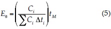 Para la evaluación hidrodinámica se empleó la curva DTR siguiendo el método descrito en Levenspiel (2002). Como trazador se utilizó NaCl, inyectándose al sistema de manera instantánea a la entrada del humedal 300 g de la sal disueltos en dos litros de agua. Cada día se midieron la conductividad y caudal del efluente hasta observar los valores normales de conductividad del agua residual tratada. Para la medición de conductividad se utilizó una sonda multiparamétrica marca Horiba U10. Luego se calculó el tiempo de retención hidráulico medio (tM), según la ecuación (3), y se construyó la curva E normalizada (Eθ), normalizando el tiempo y la concentración del trazador mediante las ecuaciones (4) y (5):