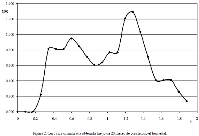 Para el modelo mencionado de dos RFP con dispersión en paralelo se obtuvo un θ1 de 0.550 y un módulo de dispersión (D/µl) de 0.194 para el primer RFP y la fracción de flujo (parámetro a de la ecuación (8)) de 0.400; mientras que para el segundo RFP, el θ2 obtenido fue de 1.257; el módulo de dispersión (D/µl) de 0.246 y la fracción de flujo (parámetro b de la ecuación (8)) de 0.600. El valor de R2 encontrado en la optimación fue de 0.896, indicando una muy buena correlación entre la función f(θ) y la curva Eθ del humedal.