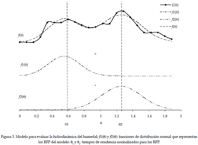Comparando la curva Eθ obtenida (figura 2) y las curvas Eθ de reactores no ideales (Levenspiel, 2002), se pudo ver la similitud de ésta con la curva Eθ, correspondiente a reactores con "flujo en caminos paralelos". Advirtiendo esta similitud y observando en la curva Eθ obtenida la existencia de dos picos acampanados, se propone un modelo hidrodinámico para el humedal en estudio, formado por dos RFP con dispersión en paralelo. El primer pico de la curva da indicios de un RFP con flujo más rápido y, por su menor altura, una menor fracción de flujo respecto al segundo RFP más lento. Se propuso que cada uno de los RFP pueda ser representando por una función de distribución normal (f1(θ) y f2(θ)), caracterizada por sus parámetros media (que representarían el tiempo de residencia normalizado de cada reactor) y desviación estándar (que representaría la dispersión de cada uno de éstos). Se propuso que la suma ponderada de f1(θ) y f2(θ), según la fracción de flujo, dé como resultado una función f(θ) (ecuación (8)):