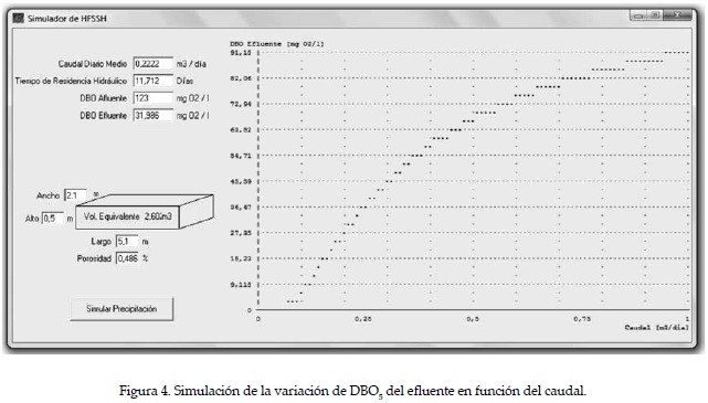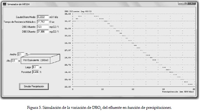 Las figuras 4 y 5 muestran la interfaz visual del software de simulación. Los rangos que admite el programa de simulación son los siguientes: un volumen de la celda (L* W * h) de 0 a 16 m3; una porosidad (ε) de 0.3 a 0.6; un caudal diario (v) de 0 a 1 m3/d; DBO5 afluente de 0 a 400 mg O2/l, y lluvias de 0 a 60 mm/d. Cabe destacar que el modelo sólo puede utilizarse en humedales que empleen para la remoción Cortaderia selloana, ya que ésta define la cinética del sistema y que el mismo no contempla variaciones de la remoción con la temperatura. Sin embargo, se podría hacer extensivo a otra vegetación (con otros valores de k) y contemplar la variación con la temperatura, introduciendo las variables correspondientes al programa.