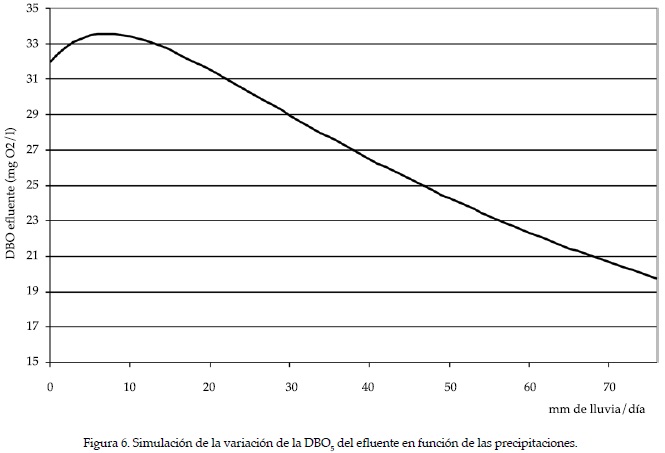 La figura 6 muestra la variación de DBO5 efluente simulado para diferentes situaciones de lluvia (mm de lluvia) para el humedal en estudio. El agua aportada por la lluvia tiene dos efectos encontrados en el sistema: a) un efecto desfavorable, pues disminuye el tiempo de residencia y así la remoción de materia orgánica, aumentando el DBO5 efluente; y b) un efecto favorable, ya que disminuye la DBO5 afluente aparente en situaciones de lluvia (ecuación (7)) por un efecto de dilución, disminuyendo la DBO5 efluente. El primer efecto se observa hasta valores de precipitaciones de hasta 18 mm de lluvia; sin embargo, se observa que el efecto de la dilución prioriza a partir de ese valor, obteniéndose un efluente con una DBO5 menor que los días sin lluvia.