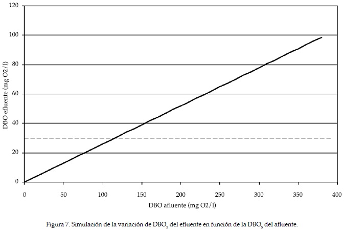 El límite máximo de DBO5 efluente para la calidad de las aguas residuales para descarga a cursos de agua superficial, según las "Normas para la protección de los recursos hídricos superficiales y subterráneos de la provincia de Córdoba Decreto Provincial 415/99" es de 30 mg O2/l. Para el sistema actual de volumen (LWh = 5.1 x 2.1 x 0.5) de 5.355 m3; ε = 0.486; ν = 0.22 m3/d; DBO5 afluente = 123 mg O2/l y, en ausencia de lluvias, las simulaciones dan un DBO5 efluente de 32 mg O2/l, y no sería apto para descarga directa a un cuerpo de agua superficial. Se simularon situaciones variando cada una de estas variables para establecer los límites admisibles.