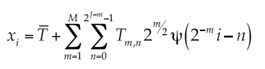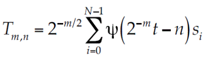 donde j y n son enteros que modifican la función wavelet; el primero es el parámetro de escala que controla la dilatación y el segundo la translación. Tm,n es el coeficiente wavelet en esa escala y posición. Si si es una serie de tiempo de longitud N potencia de 2, el subíndice i = 0, 1, 2,... N - 1; si ocurre en un tiempo discreto i. La TWD inversa se puede obtener mediante la siguiente ecuación: