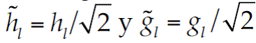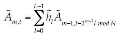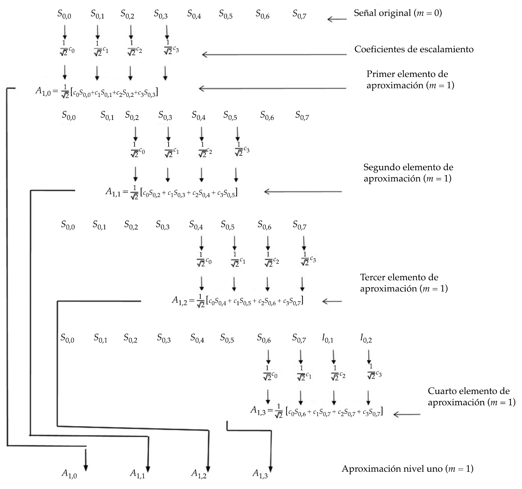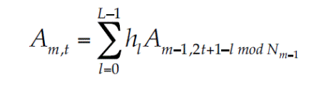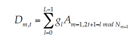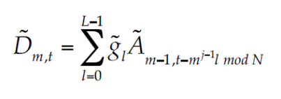 donde t = 0, 1, ..., NJ - 1, Am,t es la aproximación de la señal en la escala m, posición diádica t, Dm,t es el detalle para los mismos parámetros. L es la longitud del filtro y el índice (m - 1, 2t + 1 - l mod Nm-1 ) significa el submuestreo y remuneración diádica, y la función mod es el módulo aritmético para realizar la convolución. El proceso de reconstrucción es la transformada inversa.