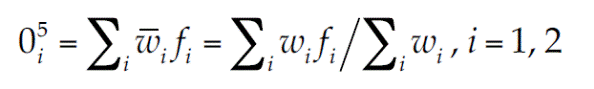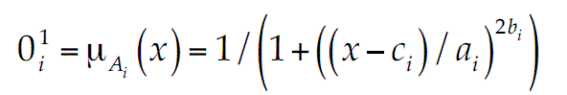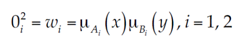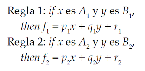 donde x y y son las entradas al nodo i (i = 1, 2), Ai y Bi son niveles lingüísticos caracterizados por una función de membresía apropiada; pi, qi y ri son los coeficientes de la combinación lineal en el sistema de inferencia tipo Sugeno; también son llamados parámetros consecuentes.