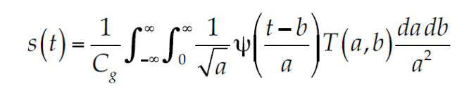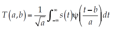 donde ψ(t - b)/a es una función wavelet admisible y se utiliza para analizar la señal s(t). Los coeficientes de transformación T(a, b) son encontrados para una específica localización, t = b, y para un específico periodo wavelet, que es función de a, el parámetro de escala. El diagrama de T(a, b), con sus respectivos parámetros a y b es conocido como escalograma. Como en la transformada de Fourier, la señal original puede ser reconstruida usando la inversa: