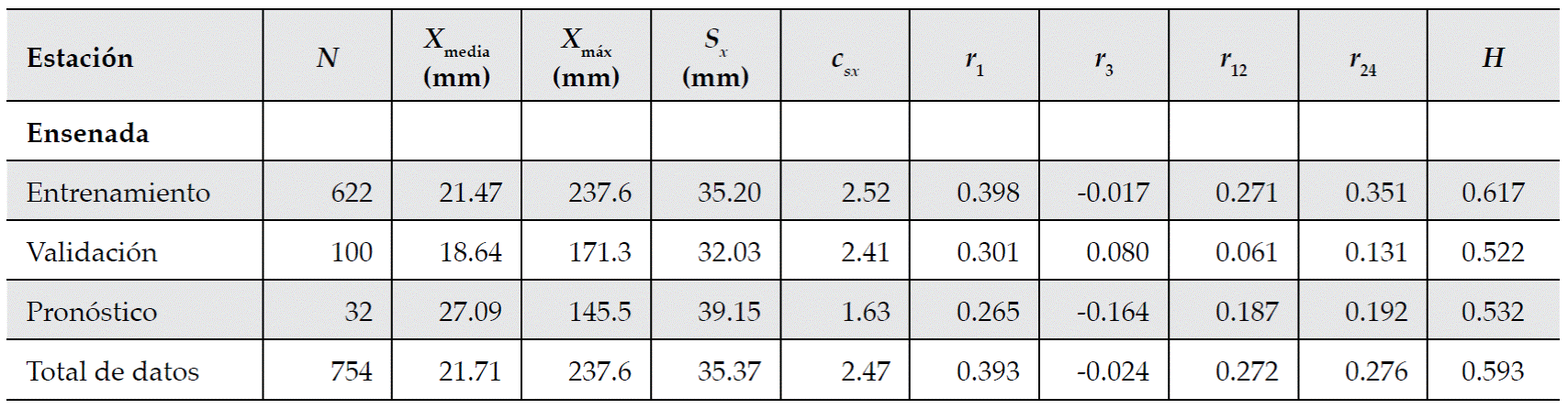 En el cuadro 1 se presentan los valores estadísticos de las series de tiempo de la estación Ensenada. La primera columna muestra la estación con cuatro valores: número de datos de entrenamiento, validación, pronóstico y el total de ellos. De la 2 a la 11 se exhiben para cada grupo de datos la media, valor máximo, mínimo, desviación estándar, sesgo, coeficiente de autocorrelación 1, 2, 3, 12 y 24 meses, respectivamente, y por último el exponente de Hurst.