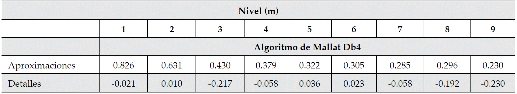 En el segundo enfoque se demuestra que la señal está conformada por una componente significativa de alta frecuencia; por lo tanto, los algoritmos de predicción no logran modelar hasta que la señal se aproxima a la media en los niveles más bajos y hace necesario eliminar la mayoría de las altas frecuencias en los niveles más altos. La influencia que tiene la TW al utilizar Db4, en el segundo enfoque, al encontrar la nueva señal se debe a que adopta la forma de la función madre de Daubechies. Por otra parte, se genera un nuevo efecto de borde, pues los coeficientes fueron mutilados y al momento de la reconstrucción esa fracción de la señal se pierde.
