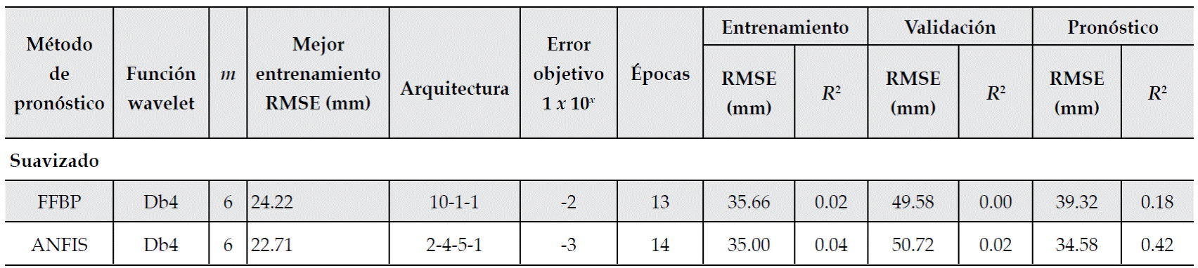 En el cuadro 2 se presentan los resultados del modelo del primer enfoque. La primera columna es el modelo de predicción con el método de rellenado en el borde. La segunda es la función wavelet. La tercera se refiere al nivel de descomposición de la transformada wavelet. La cuarta es el resultado en términos del RMSE del mejor entrenamiento. La quinta es la arquitectura del modelo de predicción. La sexta es el error objetivo. La séptima son las épocas o iteraciones empleadas. De la octava a la última se muestran los indicadores de desempeño RMSE y R 2 para los tres grupos de valores entrenamiento, validación y pronóstico. Se presentan los mejores resultados de los mapeos realizados con todas las configuraciones y los más simples debido a que existen resultados similares con otros arreglos.