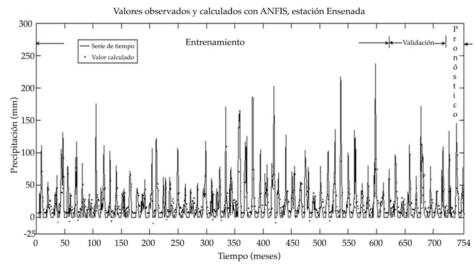 Se ha escogido la información de la Estación Climatológica 016 Ensenada (latitud 31° 53' 45" y longitud 116° 35' 47"), que se encuentra al noroeste del estado de Baja California Norte, en la vertiente del océano Pacífico, situada en la cortina de la presa Emilio López Zamora de la ciudad de Ensenada, que en lo sucesivo se nombrará como Ensenada (figura 2). De ella se escogieron los registros de precipitación recopilados por la Comisión Nacional del Agua (Conagua). La estación se encuentra en una región de clima seco templado, con un periodo de lluvias de octubre a marzo (INEGI, 1995). La serie de tiempo de precipitación se elaboró con los registros de mayo de 1948 a febrero de 2011, a intervalos de medición mensual, lo que corresponde a 754 valores de los cuales se utilizan 622 para entrenamiento, los siguientes 100 para validación y los restantes 32 para pronóstico.