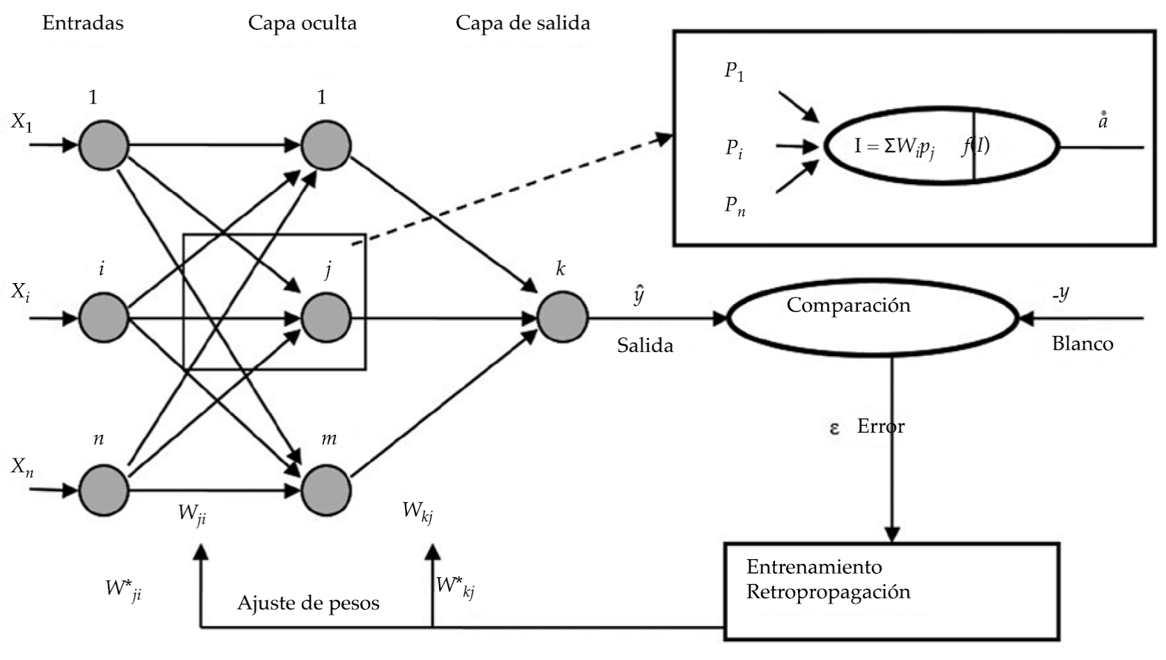 donde wji = peso de conexión de la capa oculta de la i-ésima neurona de la entrada a la j-ésima neurona de la capa oculta; wjo = sesgo de la j-ésima neurona oculta; fh = función de activación de la capa oculta; wkj = peso de conexión de la capa de salida de la j-ésima neurona de la capa oculta a la k-ésima neurona de la capa de salida; wko = sesgo para la k-ésima neurona de salida, y fo = función de activación de la capa de salida. Los pesos son diferentes para cada conexión y sus valores pueden ser cambiados durante el proceso de entrenamiento (Kim & Valdés, 2003). En la figura 3 se presenta de modo esquemático una ANN FFBP alimentada hacia adelante con entrenamiento de retropropagación de los errores.