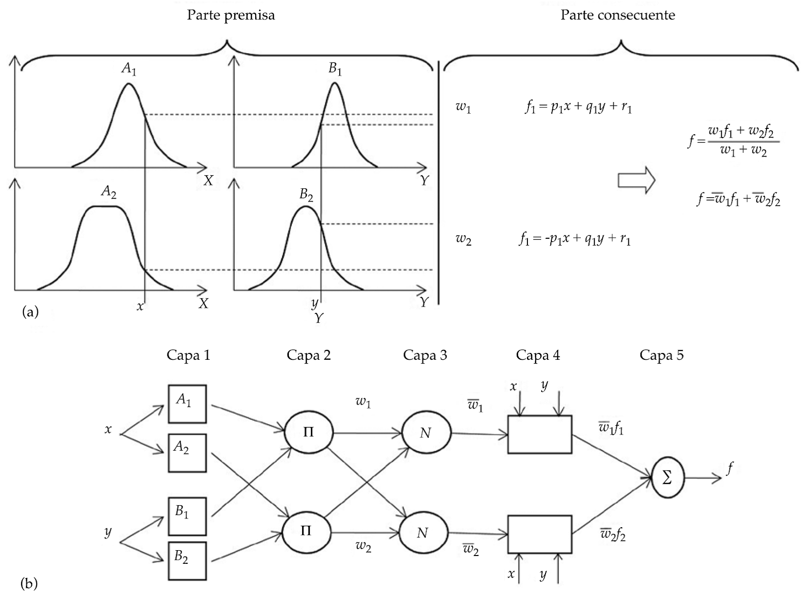 Para explicar su funcionamiento se debe consultar la figura 4. Por simplicidad se asume un FIS con dos entradas x y y, y una salida f. Se supone que la regla base contiene dos reglas difusas if- then del tipo Takagi y Sugeno. Las funciones de los nodos en la misma capa son iguales: