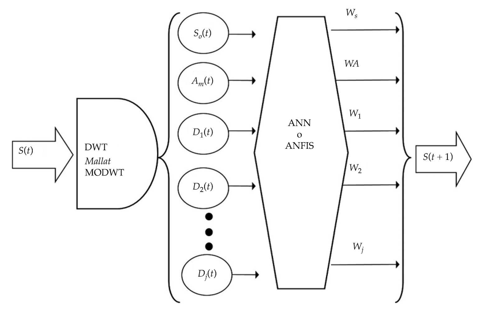 Se descompone la señal S(t) mediante la DWT, los componentes de detalle SD1(t), SD2(t),..., SDj(t); la última aproximación SAj(t); y la señal original S(t), con diferentes valores de antelación, son utilizados como entradas a la ANN o ANFIS, y mediante los pesos W se encuentra el siguiente valor de la serie S(t + 1) pronosticado.