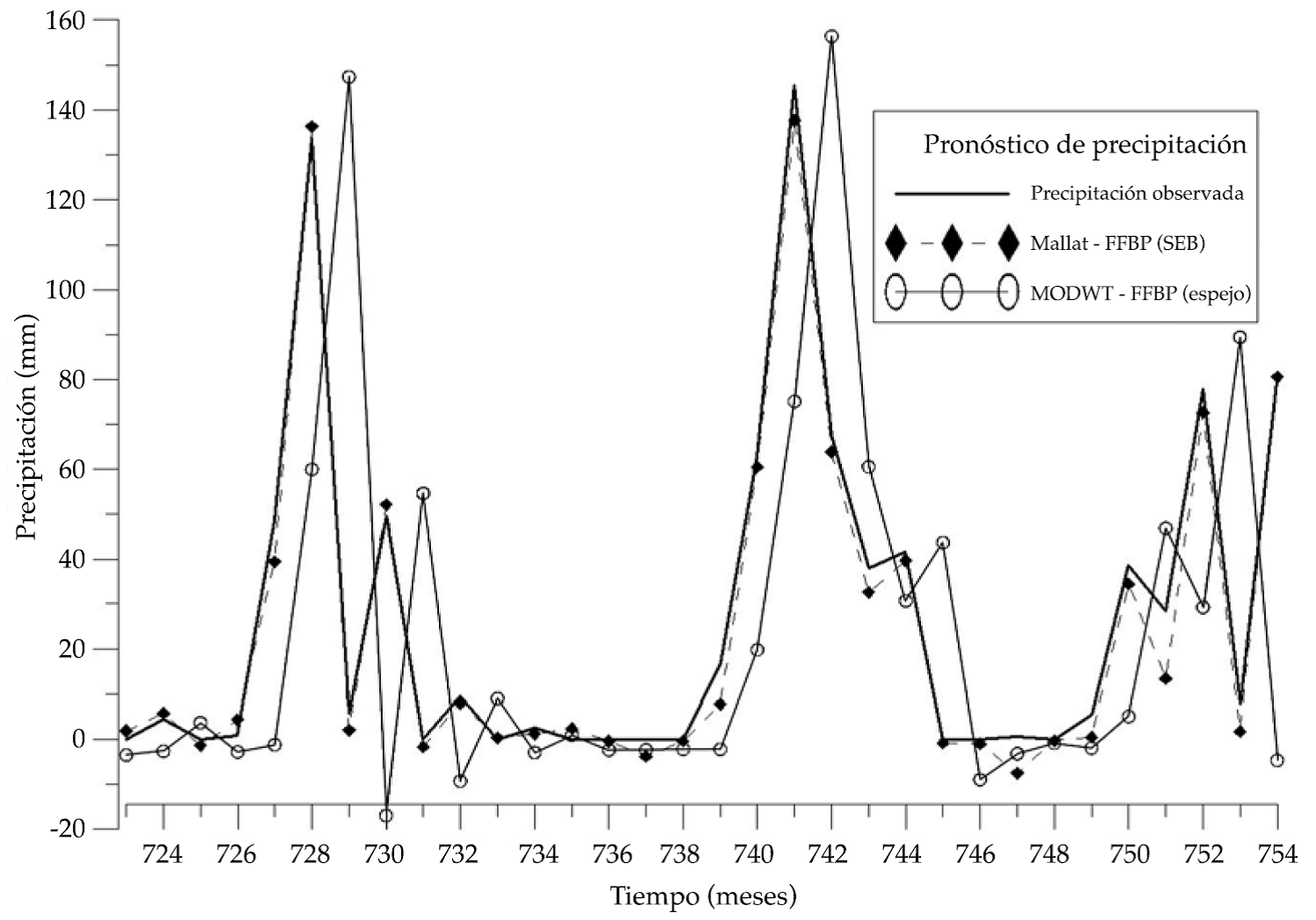 En ese mismo cuadro 2 nos referiremos ahora a los métodos híbridos, en específico a las configuraciones repetir, espejo y media; en todos los casos, los resultados de pronóstico en términos de RMSE son superiores a 30 mm, pero en la etapa de entrenamiento algoritmo de Mallat, entrega resultados inferiores que los de MODWT. Esto se debe a que este último algoritmo tiene mayor penetración del efecto de borde, entonces existe mayor información futura almacenada en los coeficientes que se introdujo en el momento de realizar la convolución. En la configuración MODWT-FFBP con el rellenado de espejo entrenamiento perfecto en términos de la pareja (RMSE, R2) (1.11, 1.0) , validación (0.12,1.0), pero en pronóstico (40.93, 0.08), este grupo de datos tiene un coeficiente de correlación de 0.19; sin embargo, se utiliza otro grupo de datos, por ejemplo, el 422 en el rellenado con un coeficiente de correlación mayor (0.823); la pareja de indicadores de desempeño se incrementa a (23.68, 0.67). Ahora, si utilizamos en el rellenado un grupo de valores con coeficiente de correlación igual a 1.00, es decir, la configuración SEB, la pareja de indicadores de desempeño es de 0.00, 1.00. Dicho de otra forma, se puede usar un rellenado de espejo con una serie más periódica de tal forma que el coeficiente de correlación se incremente y automáticamente el indicador de desempeño también suba; es decir, los métodos híbridos y el pronóstico mostrados están íntimamente relacionados con el coeficiente de correlación que existe entre los valores de relleno y los de pronóstico debido a que esta información está guardada en los coeficientes del proceso de convolución. De todos los métodos de pronóstico válidos, esto es, que no introducen información futura, los resultados son coherentes con el indicador caótico de Hurst; es decir, la serie de tiempo no se puede predecir, es al azar; por lo tanto, los indicadores de desempeño exponen resultados bajos, como era de esperarse.