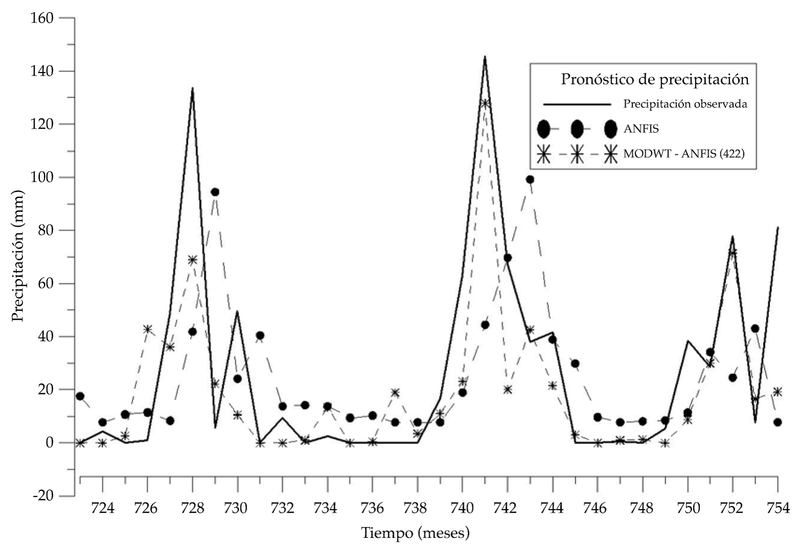 El proceso de pronóstico consiste en descomponer la serie original hasta el valor t. Se aplica el algoritmo de pronóstico y se obtiene el valor siguiente t + 1 pronosticado; la segunda vez se descompone hasta el valor t + 1 de la serie original y se obtiene el siguiente valor t + 2 pronosticado, y así de forma sucesiva hasta llegar al final de la serie original. Es importante recalcar que el pronóstico es a plazo inmediato, o sea, se encuentra el valor siguiente. De acuerdo con la literatura revisada, la precipitación es complicada de predecir con estas técnicas a corto, mediano o largo plazos.